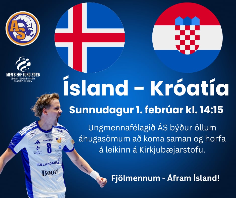 Áfram Ísland !! Horfum saman á leikinn á morgun á Kirkjubæjarstofu. Leikurinn byrjar kl. 14:15. By UMFÁSOn January 31, 2026 Share FacebookTwitterLinkedInPinterestWhatsAppEmail