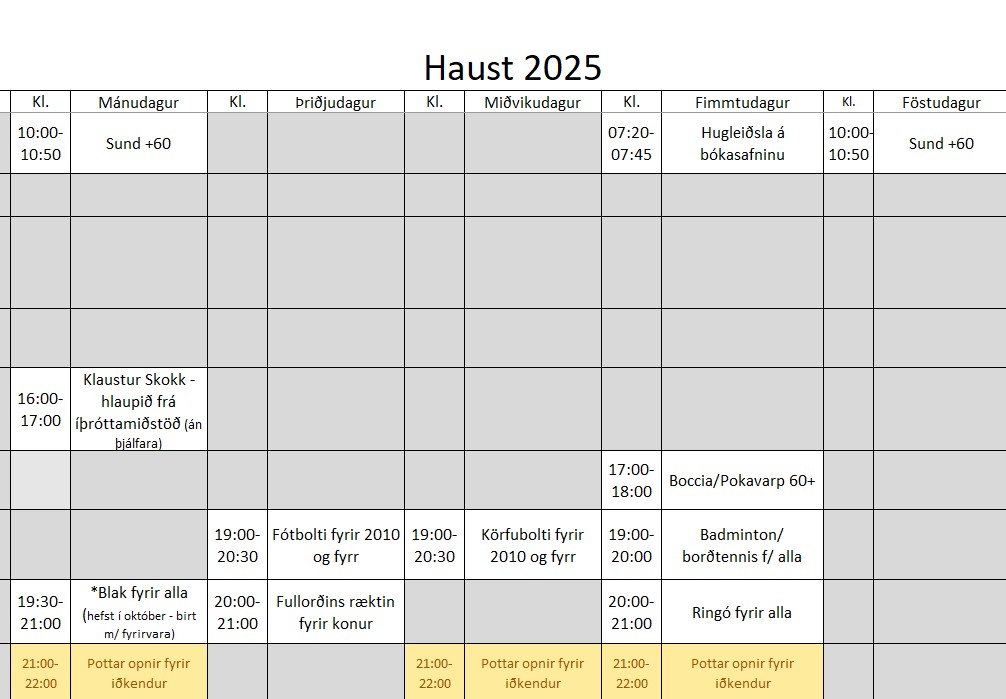 Flest kvöld vikunnar eru í boði fjölbreyttar íþróttir fyrir fullorðna í íþróttasalnum á Kirkjubæjarklaustri. Allir eru velkomnir til að taka þátt, hvort sem um er að ræða reglulega iðkendur eða þá sem vilja bara hreyfa sig og hafa gaman.