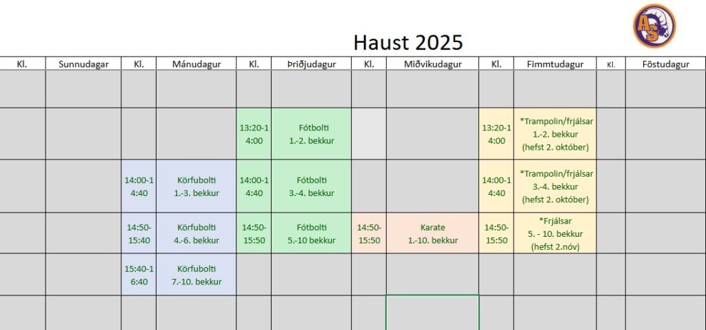 Tímatafla íþróttaæfinga á haustönn By SiggiOn November 10, 2025November 10, 2025 Share FacebookTwitterLinkedInPinterestWhatsAppEmail